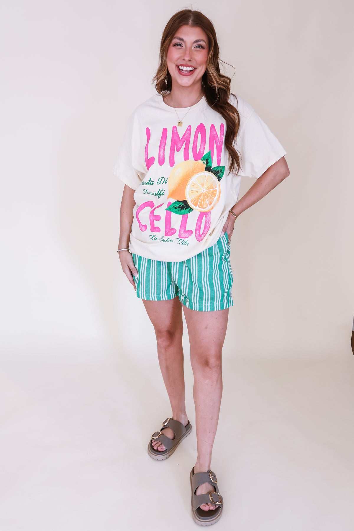 Embrace the vibrant spirit of Italy with this eye-catching graphic tee in the season’s hottest shade of yellow. Featuring a bold "LIMONCELLO" print in a playful hot pink hue, this top adds the perfect pop of personality to your casual wardrobe. A detailed lemon graphic with a whole lemon, juicy slice, and lush green leaves brings the design to life, while "Costa Di Amalfi" and "La Dolce Vita" scripted below capture the charm of the Italian coast.