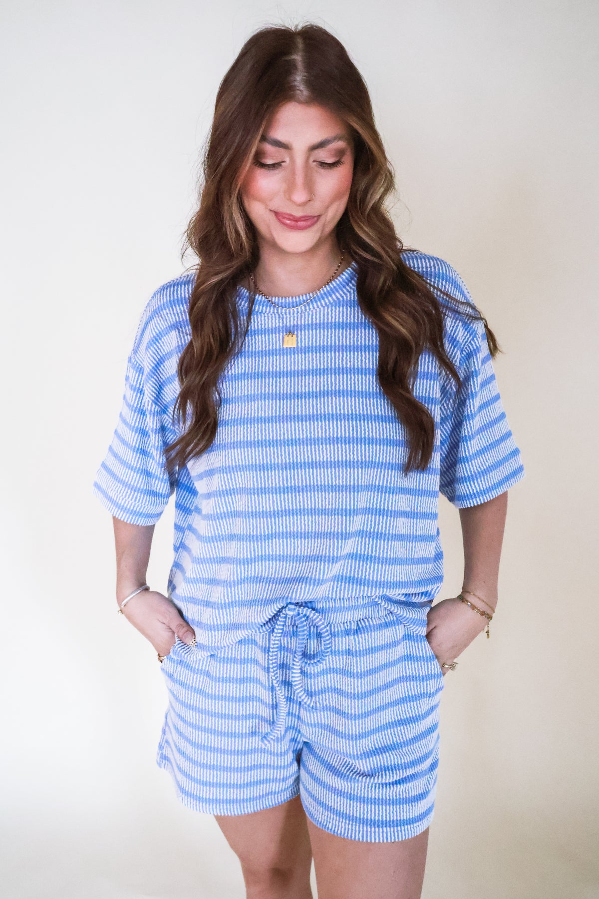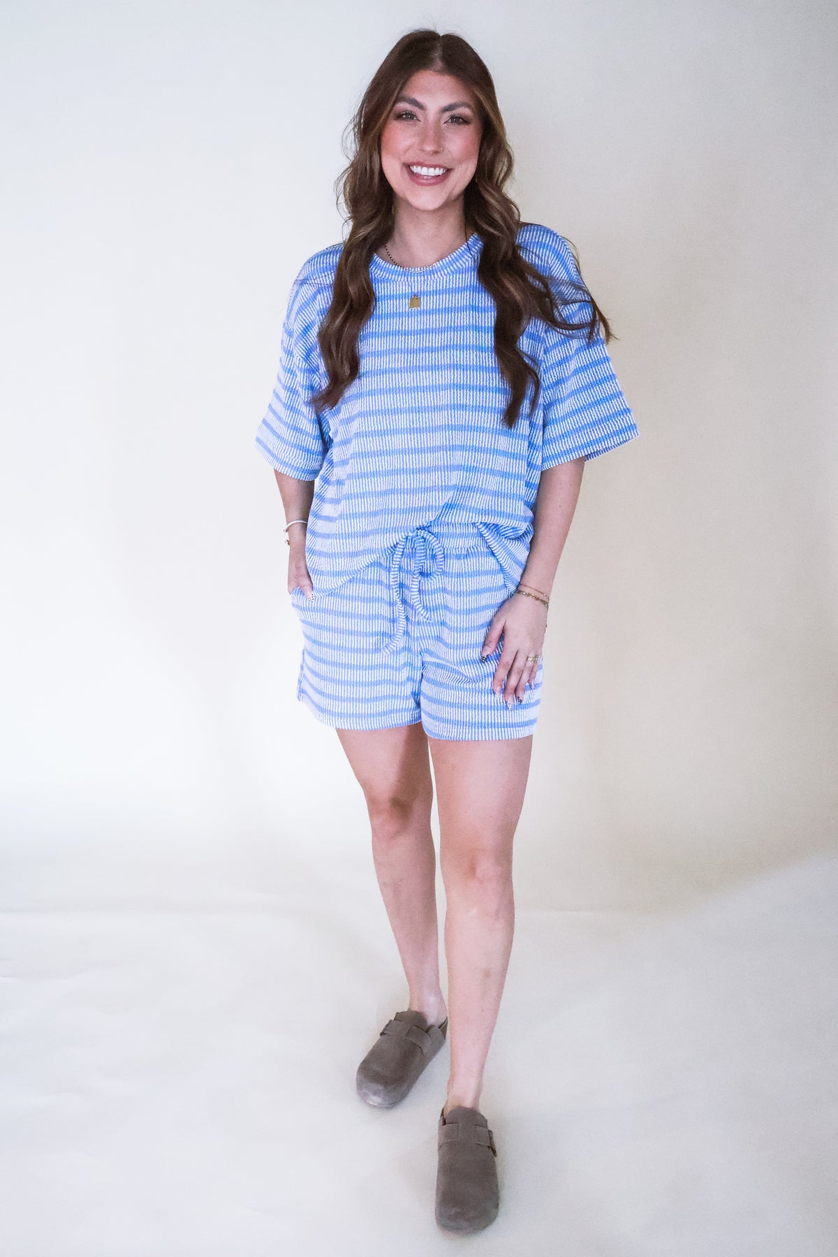 Raised Rib Striped Tee & Shorts Set - Blue