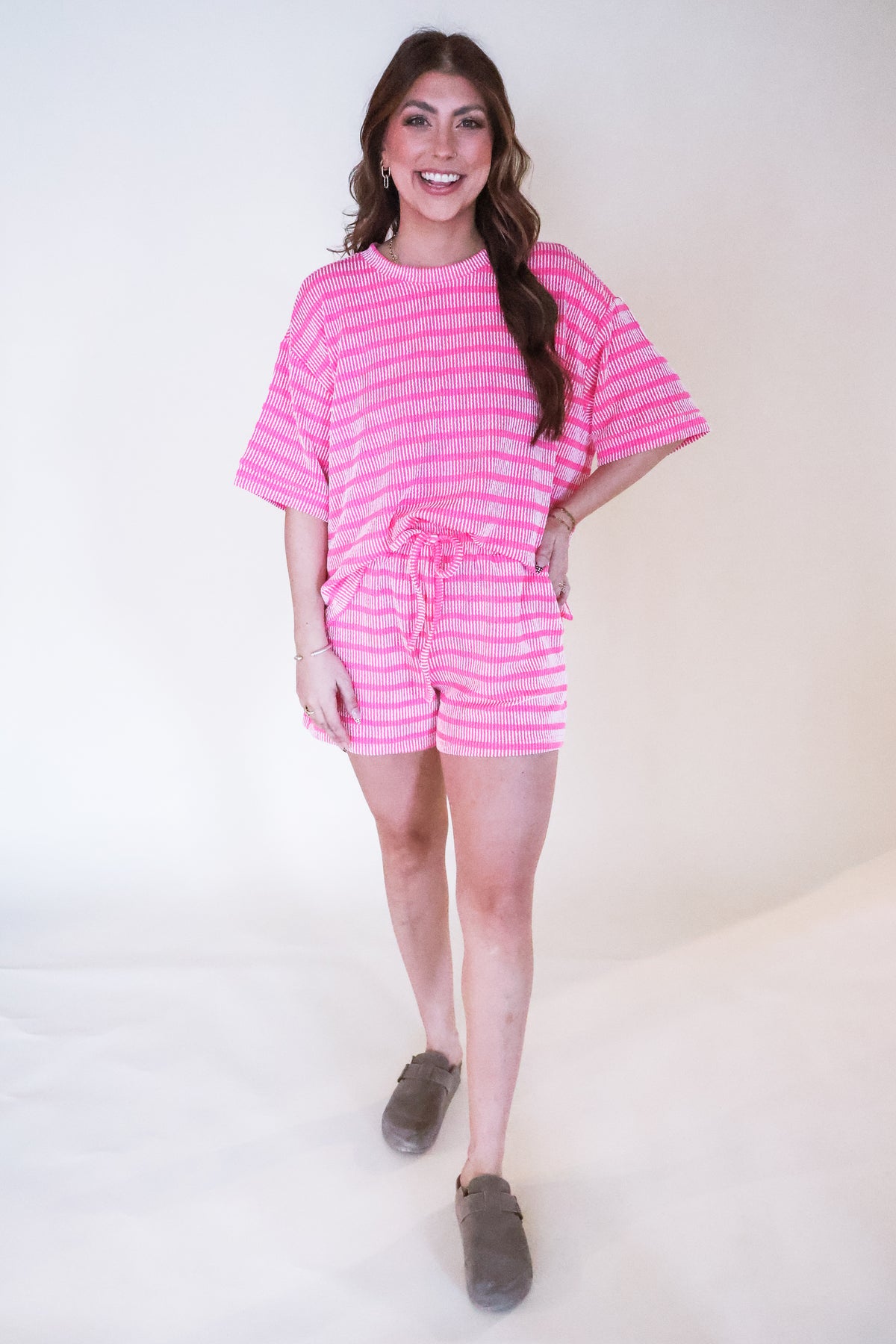 Raised Rib Striped Tee & Shorts Set - Hot Pink