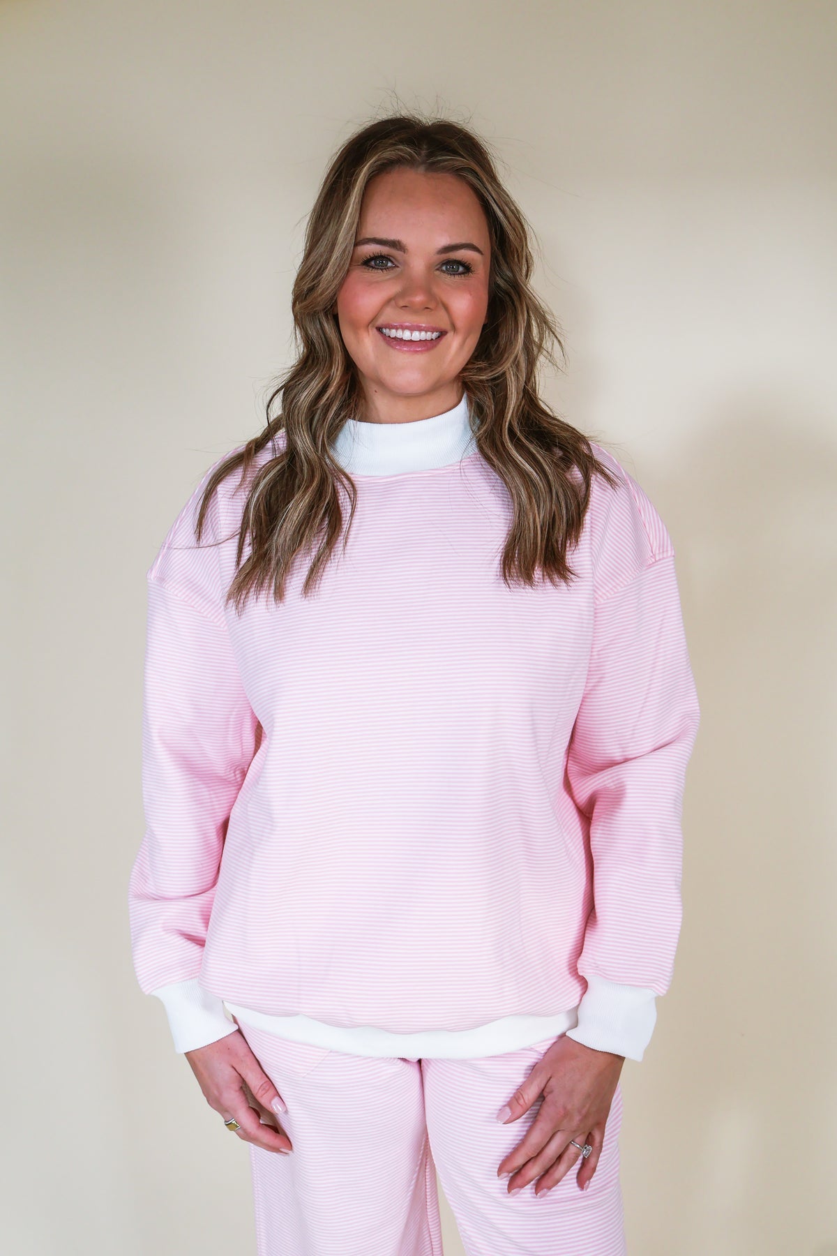 Stay comfy and cute in this striped super soft lounge top. Featuring pink and white stripes and a cozy mock neck sweatshirt design, this piece is perfect for lounging or casual everyday wear. Made from an ultra-soft fabric, it offers all-day comfort with an easy, relaxed feel.